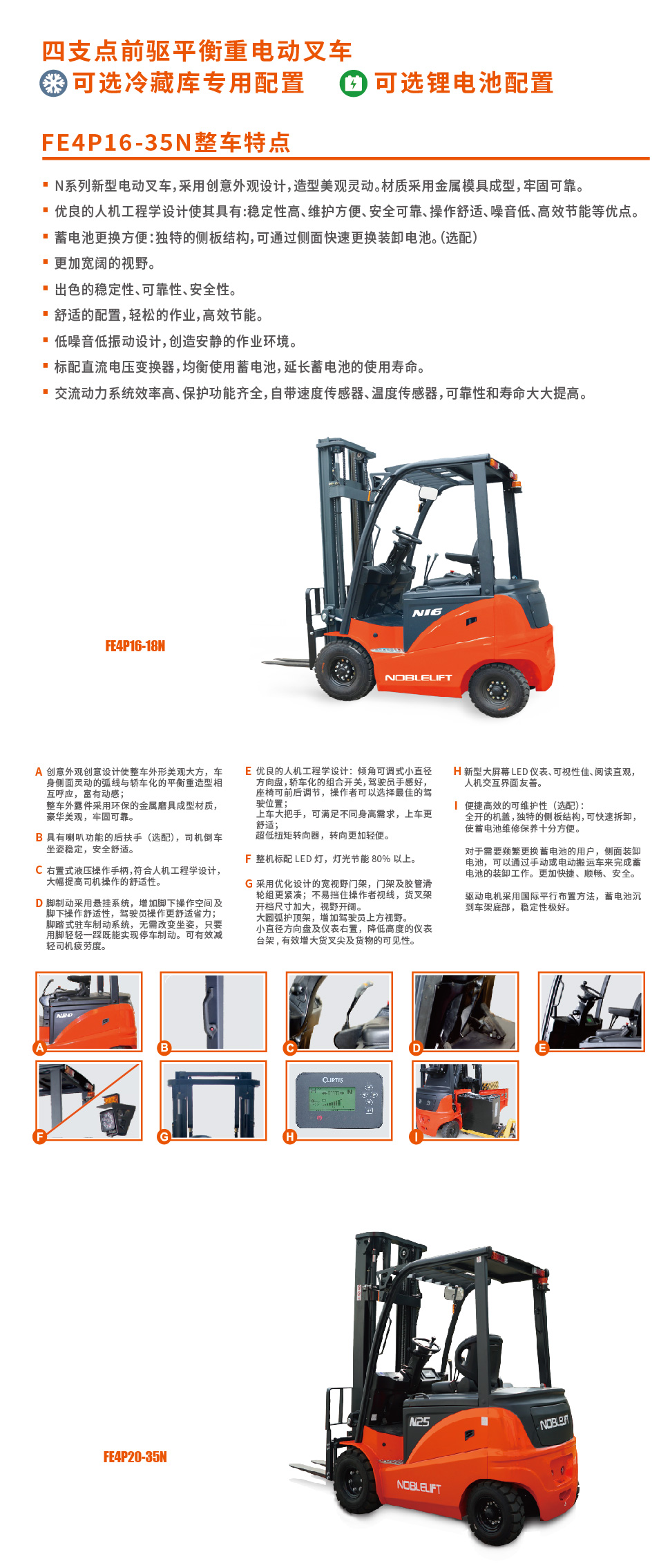産品賣(mai)點 ▪N系列(liè)新型電(dian)動叉車(che),采用創(chuàng)意外觀(guan)設計,造(zao)型美觀(guan)靈㊙️動。材(cai)質采用(yòng)金屬模(mó)具成型(xíng),牢固。 ▪優(yōu)良的人(rén)機工程(cheng)學設計(ji)使其❄️具(jù)有:穩定(dìng)性高、維(wei)護方便(biàn)、安全、操(cāo)作舒适(shì)、噪音低(dī)、節能等(děng)💛優點。 蓄(xu)電池更(gèng)換方便(bian):獨特的(de)側闆結(jié)構🌐,可通(tong)過側面(miàn)快速更(gèng)換裝卸(xiè)電池。(選(xuǎn)配) 更加(jiā)寬闊的(de)視野。