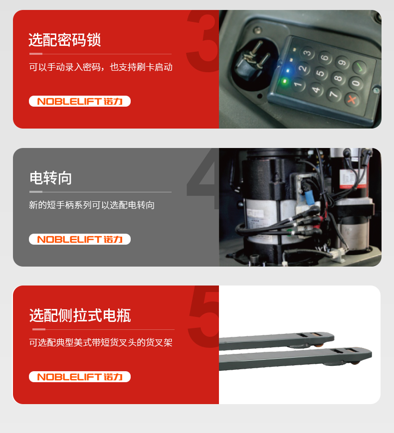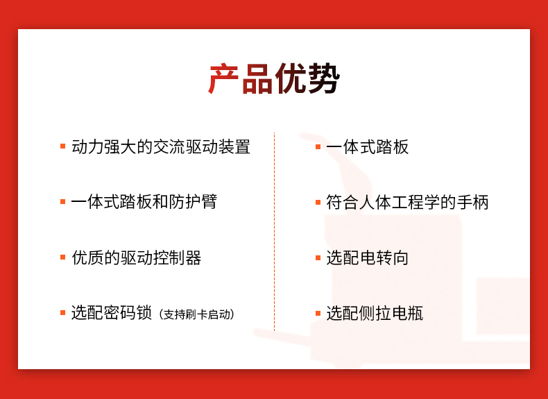 産品賣(mài)點 動力強大(da)的交流驅動(dong)裝置 一體式(shi)踏闆和✊防護(hu)臂 驅動控制(zhì)器 選配密碼(ma)鎖 一體式踏(tà)闆 符合人體(tǐ)工程學的手(shou)柄 選🚶配電轉(zhuǎn)向 選配側拉(la)電瓶