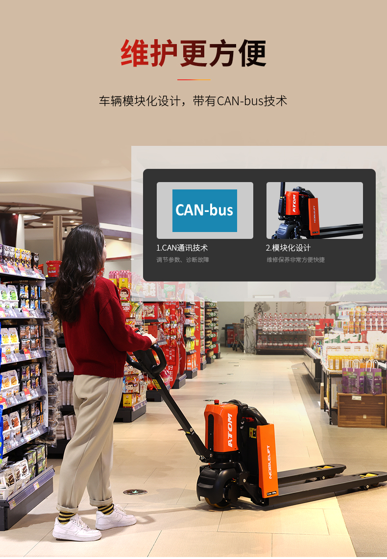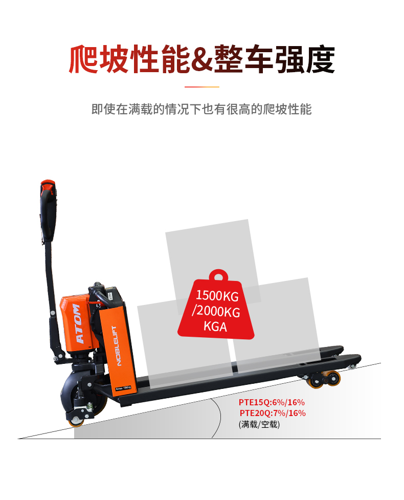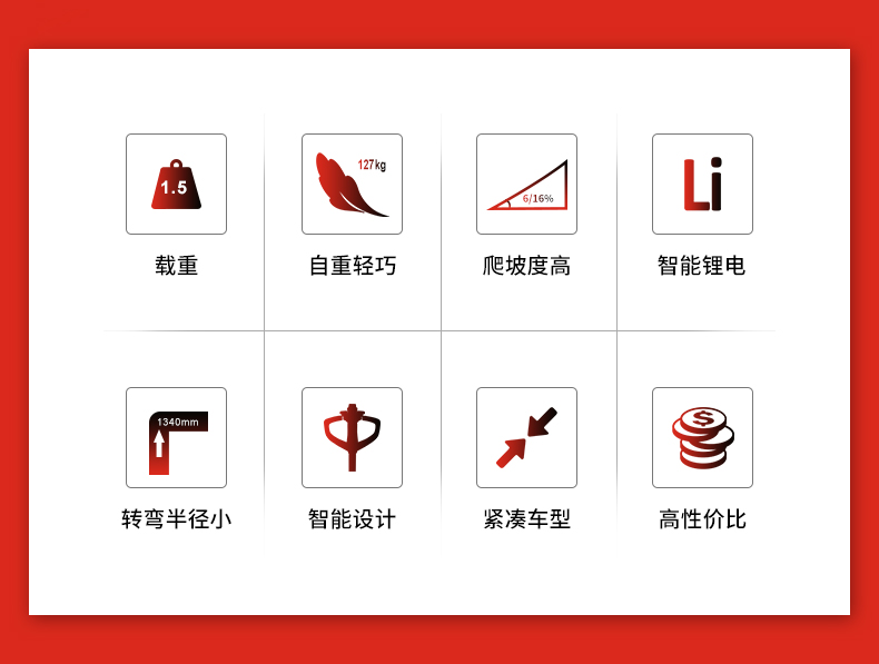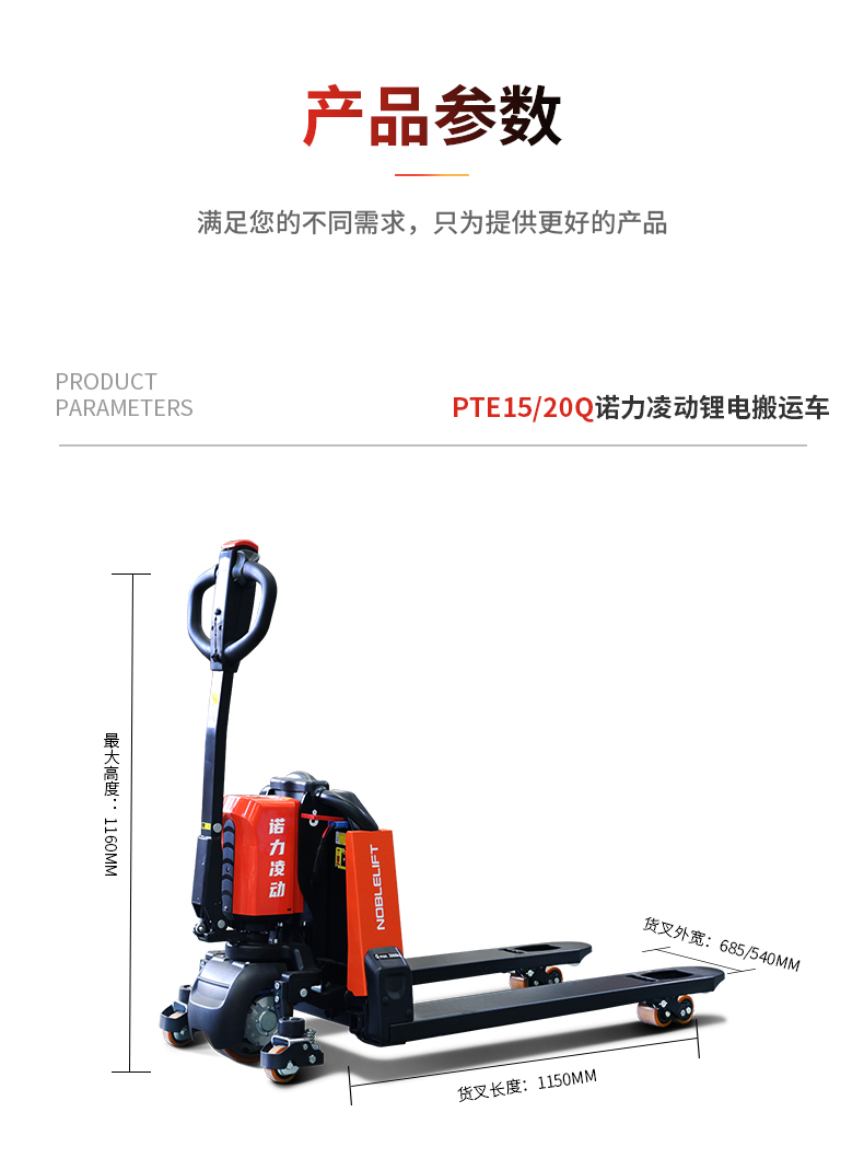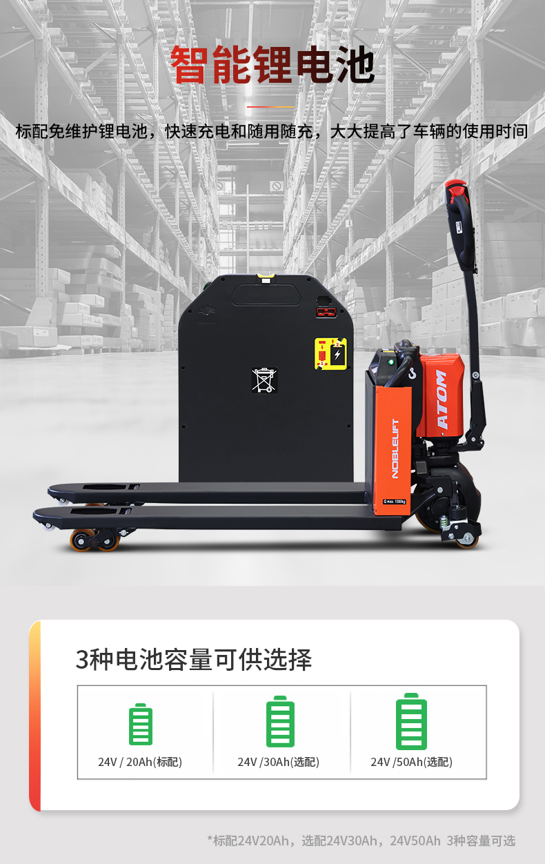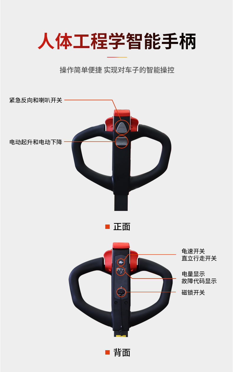 産品賣點 小噸(dun)位物料搬運的理(lǐ)想方案 緊湊&硬朗(lang)的設計 自重小 锂(li)電池快速充電功(gong)能 零售店和卡車(chē)等應用場合的理(lǐ)想方案 電池更換(huan)簡易
