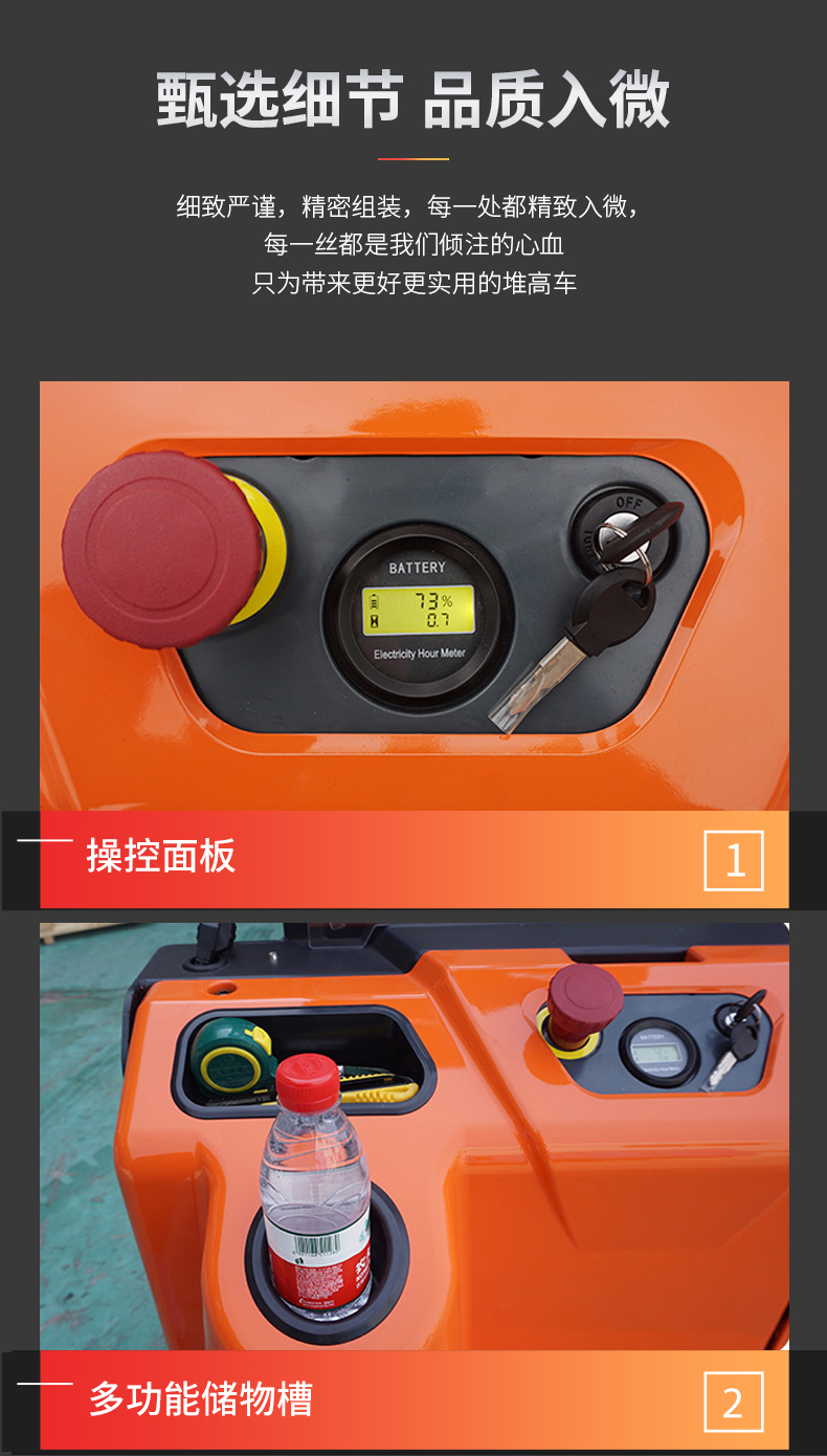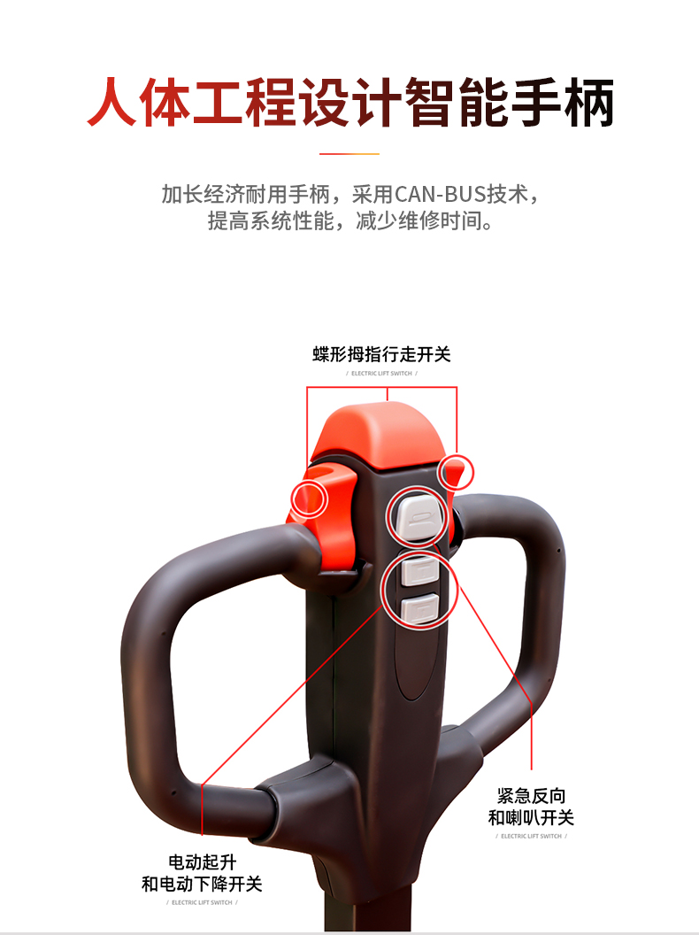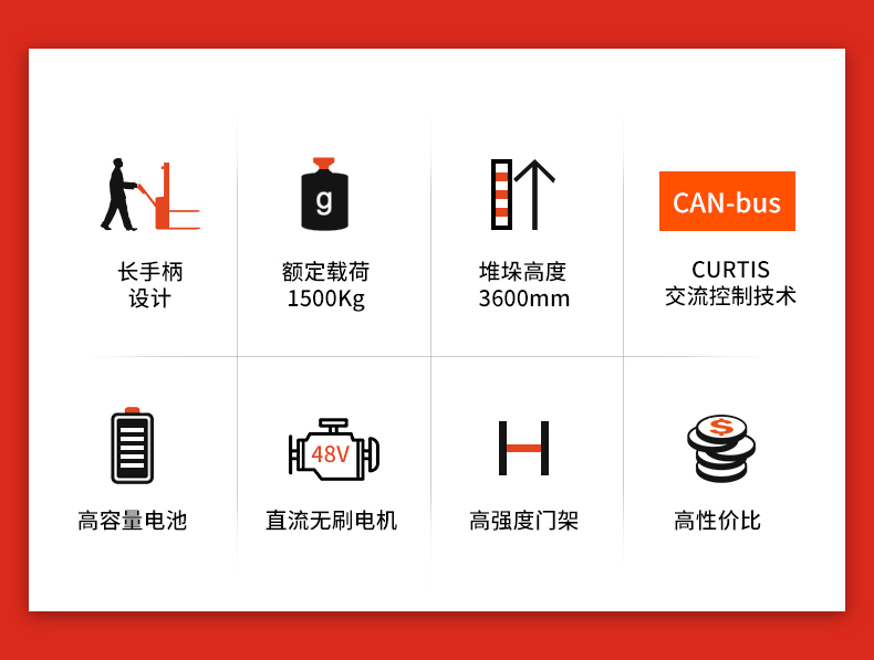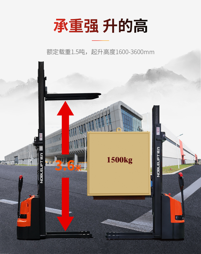 産品賣點(diǎn) 長手柄設(shè)計 額定載(zai)荷1500kg 堆垛高(gāo)度3600mm CURTIS交流控(kòng)制技術 高(gāo)容量電池(chí) 直流無刷(shuā)電機 高強(qiáng)度門架
