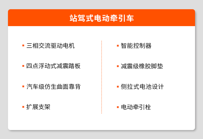 産(chǎn)品賣點 載(zai)荷牽引:3/5t 額(é)定牽引力(li):800/1000N 行駛速度(dù)(滿載/空💯載(zǎi)):6/9、7/12km/h 驅動單元(yuán):1.9/2.6kw 标配24V375/465Ah鉛酸(suān)電池