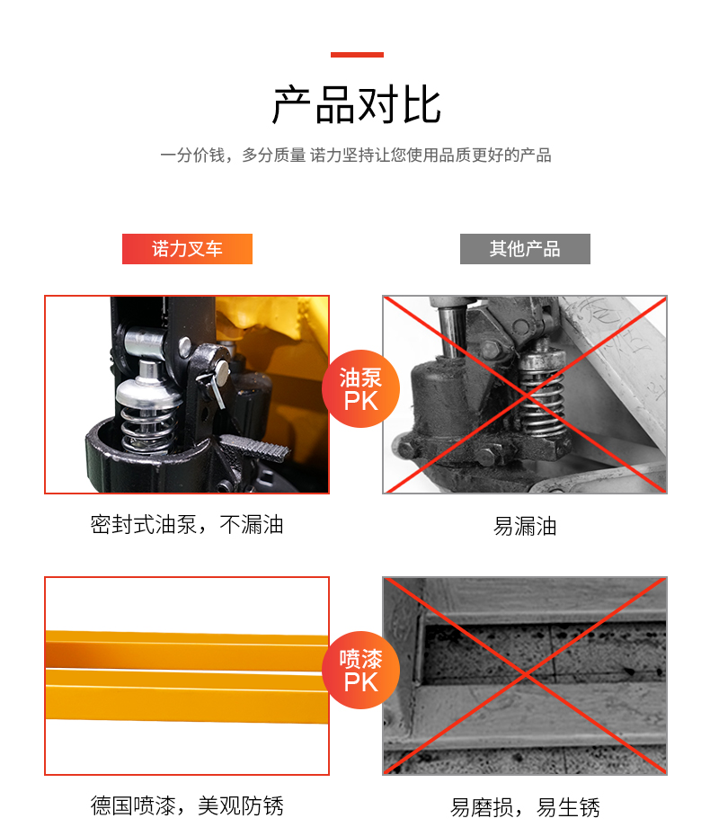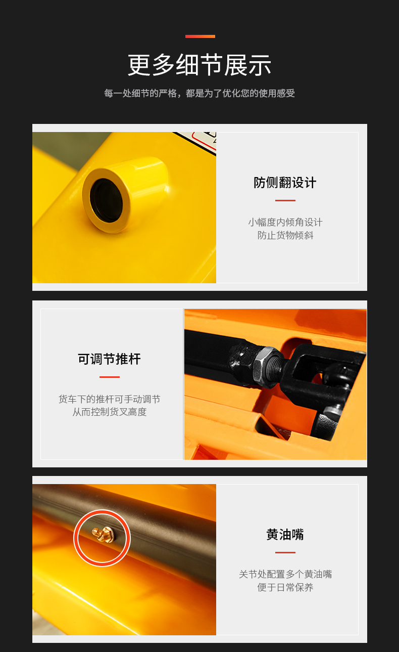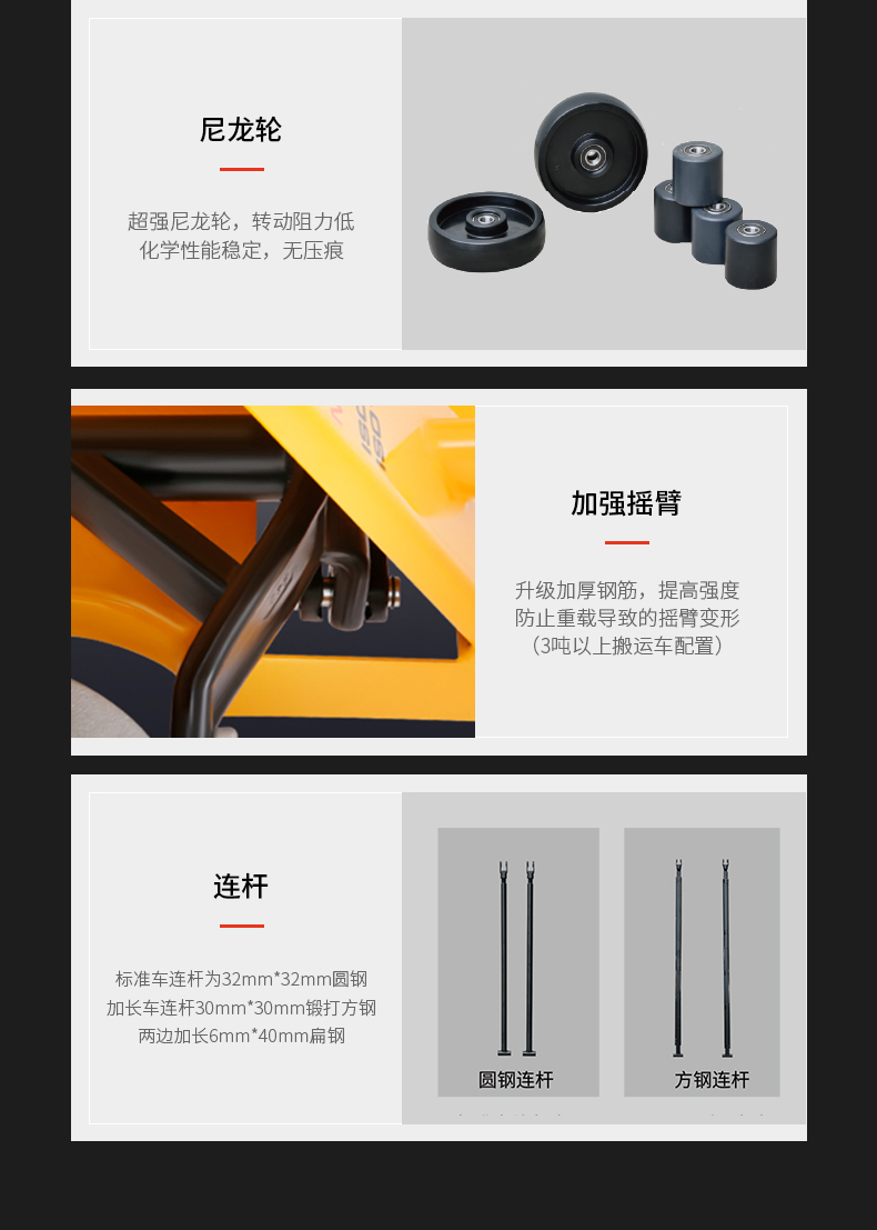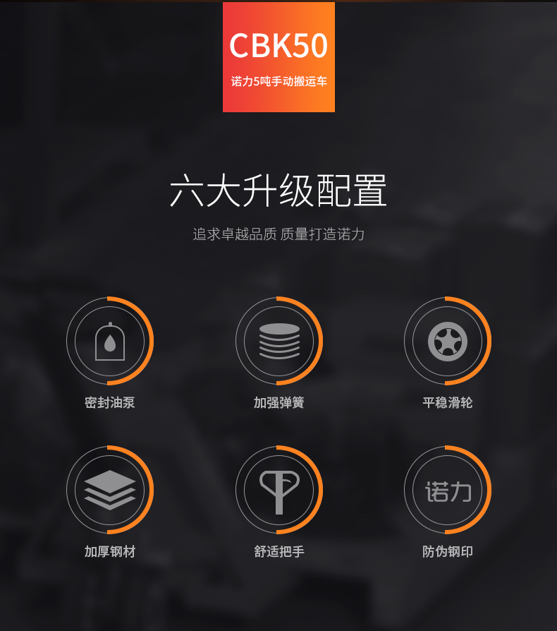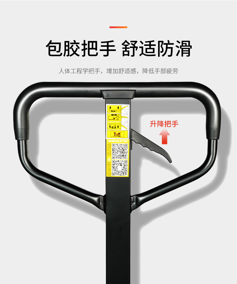 産品賣點 設計(ji)出衆,品質的搬(bān)運車 是各種超(chao)市、倉庫和工廠(chǎng)段距離手動搬(bān)運貨物的理想(xiǎng)選擇材料選用(yòng)加強🔅型剛💯才,堅(jiān)固耐用,外形精(jing)緻美觀;德國标(biāo)準WAGNER噴塗㊙️系統确(que)保噴塗質量所(suo)有的轉向軸處(chu)都加以潤滑,确(que)保良好的操作(zuò)性和輕松的轉(zhuǎn)向;複合套✌️和鍍(dù)鉻軸确保了安(ān)靜平穩的起升(shēng)和行走,延長使(shi)用壽命
